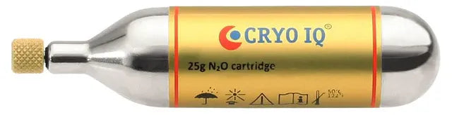 A 25g medical-grade dinitrogen oxide (N₂O) gas cartridge featuring CryoIQ's OxiBlock® coating, which ensures 100% pure, contamination-free gas for reliable cryosurgery treatments.